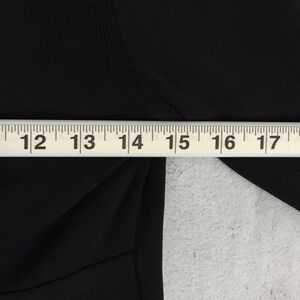 Women's Size Medium. 65% Rayon / 35% Nylon. Heavy ribbed knit with lots of stretch. Solid black. V-neck cross front that ends at sewn front waistband with accent bow. Long sleeve. Straight hem. Very stretchy - would form fit.