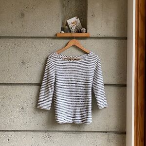Really well made heathered black and white 3/4 sleeve boxy style Loft Top. Nice and lightweight perfect for layering an outfit or under a blazer. easily goes with everything. For work I’ve worn it with a pencil skirt, black pants, coloured skirts and even over a body con dress. Has a great exposed detail zipper at the back. Great little versatile piece for your wardrobe. I’m just ready to refresh/switch out my wardrobe so I’m letting some pieces go. Laundered and ready for the next home. Fits true to size. Please feel free to request measurements you may need or send questions you have before purchasing.