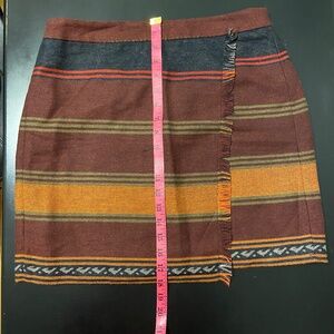 Chic and cozy Southwestern-inspired wool-blend skirt featuring a sturdy jacquard tribal print and a flattering faux-wrap effect. Finished with fringe edges for added texture and style. Fully lined for comfort with a secure back zip closure.