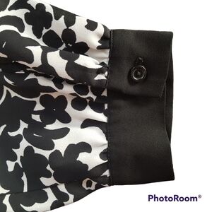 Ann Taylor Loft Long Sleeve Semi Sheer Black & White Floral Blouse With Black Contrast Cuffs And Neckline.
