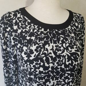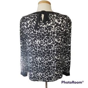 Ann Taylor Loft Long Sleeve Semi Sheer Black & White Floral Blouse With Black Contrast Cuffs And Neckline.