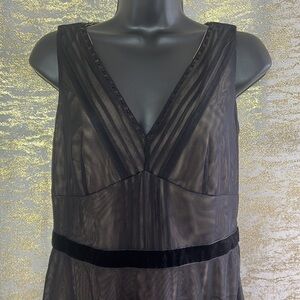 - Ann Taylor LOFT Black Mesh Sheer Lined A-line Sleeveless Dress. Black mesh outer laver,Tan interior layer,Embroidered flowers in front and back,Jewel embellishments,Sequins, Sequins and beads make a floral design on the skirt which is just gorgeous and gives it just the right amount of sparkle!!