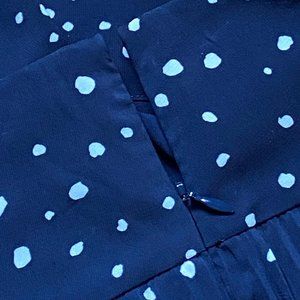 Light-weight and lined pleated skirt with a 3 inch waistband. Hidden side zipper with hook-and-eye closure. Navy blue with white polka dots. Shell: 95% polyester and 3% spandex. Lining: 96% polyester and 4% spandex. Size 12. Total length: 22inches/56cm. Ships from a smoke-free home.