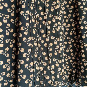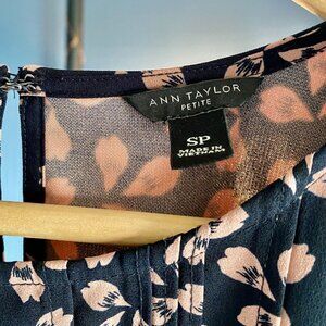 Ann Taylor petite navy blue with peach petal pattern blouse, size SP. Wavy ruffles at hems, pleats at front. Excellent almost new condition. Cat friendly, nonsmoking home.