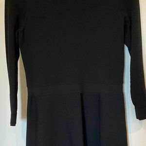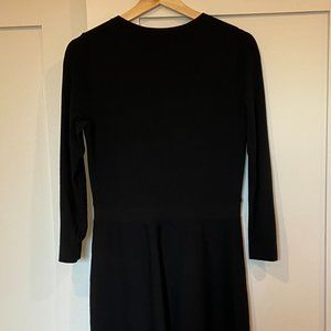 Black long-sleeve form fitting dress with waist band and ruffle bottom detailing.