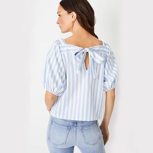 Summery stripes raise the style bar of this easy square neck top, presented with a pretty bow-tied back. Square neck. 3/4 sleeves with shirred sleeve caps and elasticized cuffs. Square back with ties. Ann Taylor Stripe Tie Back Square Neck Top