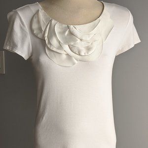 Lovely Ann Taylor cream top with scalloped detail around neck - some of the scallops have a very thin silver tiny beading around the edge. Has a bit of stretch as contains spandex material. Size XS.