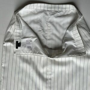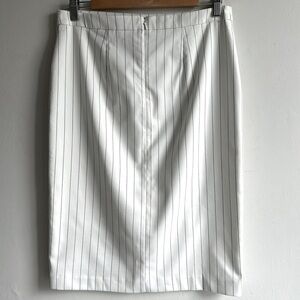 Flattering NWT classic pencil skirt with a front slit. White with fine navy pinstripes.