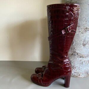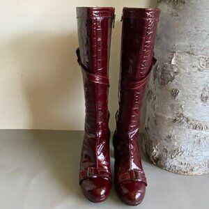 These fit Sz 8.5 perfectly, Made in Italy, Retro style Anna Biagini Oxblood Red Reptile Print Genuine Patent Leather Heeled Boots. Details: Leather upper & leather lining, instep zipper closure, wrapped rounded heel 3 1/4" height, Knee high shaft, round toe. For a timeless & vintage inspired drama appearance wear these rare knock out boots with a midi skirt, sweater dress, leggings, skinny jeans or mini dress. They are in Very Good to excellent preowned condition, minimal signs of wear.