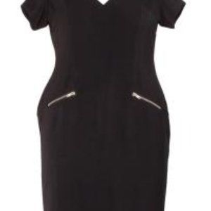 Plus size designer Anna Scholz black, weighted fabric, figure hugging dress with fuchsia satin lining and exposed zipper up the back. Hugs your curves just right and gives you a great shape.