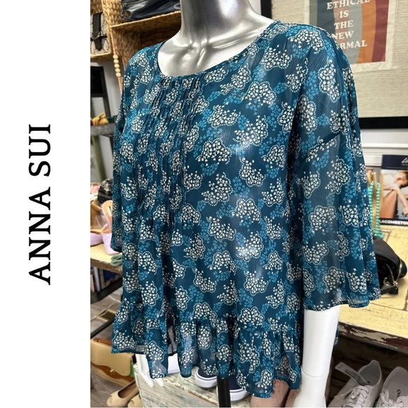 Anna Sui Sheer Flowy Bohemian Boho Blouse Gatherer Hem Oversize Small