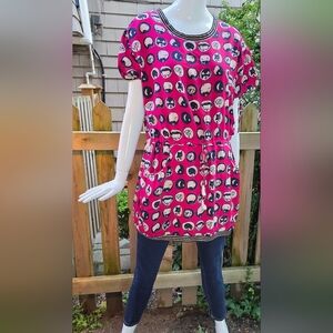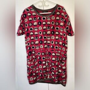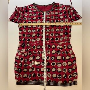 Red loose fitting silk dress with side pockets and drawstring waist. Retro graphic print with silver detail throughout and black & silver striped trim on neckline and hem . Adjustable sleeves can be scrunched up with toggle or worn loose. Size small.
