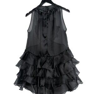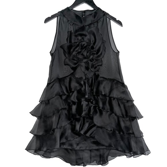 Solid black silk organza sheer fabric tunic. Oversized flower appliqué at front. Layered ruffle accent. Sleeveless. Buttons closure at back. Made in France.