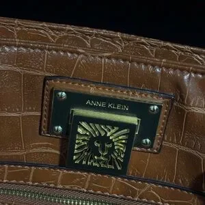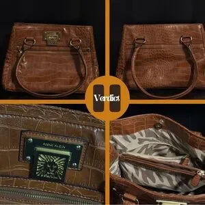 Brown crocodile pattern handbag with gold accents and top zipper closure. Interior includes one zip pocket and one slip pocket. 🛍️✨
