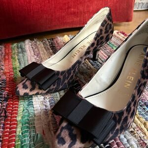 Chic animal print heels by Anne Klein. Features bold black bow detail. Ideal for a stylish outfit.