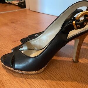 Selling a gorgeous pair of Anne Klein Black Leather Peekaboo Toe High Heels. Women’s size 8 with adjustable back strap.