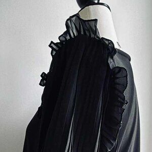 Anne Klein turns a simple black top into a moment: a smooth, stretch-knit body that skims (not clings) and sheer pleated chiffon sleeves with ruffled cuffs—light-catching and instantly dress-up. Tuck it into dark indigo straight-leg jeans, add a sleek leather belt, a signature necklace, and knee boots for polished edge; or switch to a satin midi skirt and strappy heels to let the sleeves take center stage.