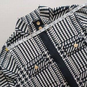 A beautiful sweater coat in a black & white glen plaid pattern. It's a straight cut design with a comfortable stretch. The stand collar and flap pockets have snap button closures. The front has a mid-length zipper that is hidden beneath a full-length flap. Perfect for spring and fall. Great condition.