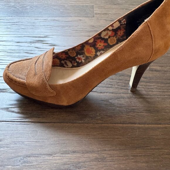 Elevate your style with these chic Anne Klein suede heeled loafers in a warm caramel brown. Made from soft suede, they combine the timeless look of a loafer with the elegance of a high heel. The floral print lining adds a fun, feminine touch.