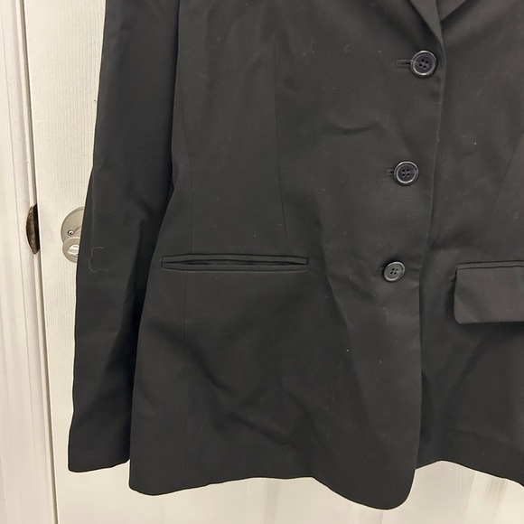Classic black blazer with three buttons on front. Pockets in front can be worn with pocket flap out, or it can be tucked in to create different look (see pics). Blazer has minor stretch to ensure comfort, but still holds its shape. Excellent used condition….I don’t think it was ever worn (I don’t remember ever wearing it and it looks new, one of the pockets is still sealed). Needs to be steamed, but otherwise looks great. Dry clean.