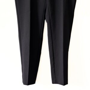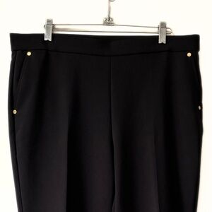 These Anne Klein pull-on dress pants are designed for both comfort and sophistication. These sleek black trousers feature a comfortable elastic waistband. The tailored, straight-leg silhouette provides a polished, professional look, while the subtle gold-tone accents add a touch of elegance. Perfect for the office, travel, or any occasion where style meets ease. In excellent condition.