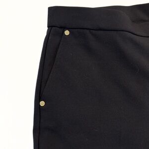 These Anne Klein pull-on dress pants are designed for both comfort and sophistication. These sleek black trousers feature a comfortable elastic waistband. The tailored, straight-leg silhouette provides a polished, professional look, while the subtle gold-tone accents add a touch of elegance. Perfect for the office, travel, or any occasion where style meets ease. In excellent condition.