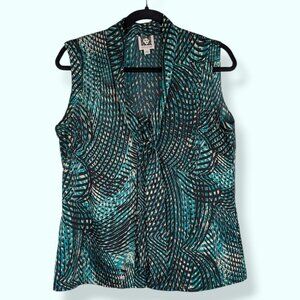 This top by Anne Klein Suit Separates is made of a polyester/elastane blend (97/3) and features a green, black, and beige swirly striped abstract pattern with a satin finish. The top is sleeveless and has a v neckline and a button front with hidden buttons. The collar turns into 2 long strands that can be tied in the front (see pics 3 and 4). The top is lightweight and comfortable, and looks great as part of a business outfit or something more casual.
