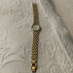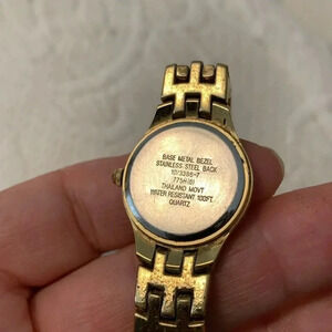 Goldtone chain link bracelet band. Base metal bezel. Stainless steel back. Water Resistant 100ft. Thailand movement. White face. gently worn with some goldtone rubbed off showing grey in face and clasp. Some scratches in back of bracelet links. Needs battery. Pls see photos for details.