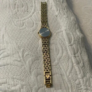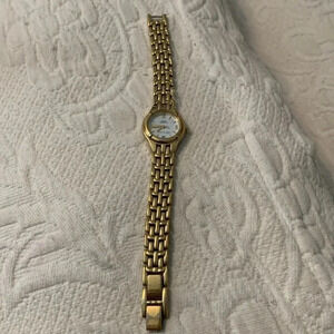 Goldtone chain link bracelet band. Base metal bezel. Stainless steel back. Water Resistant 100ft. Thailand movement. White face. gently worn with some goldtone rubbed off showing grey in face and clasp. Some scratches in back of bracelet links. Needs battery. Pls see photos for details.