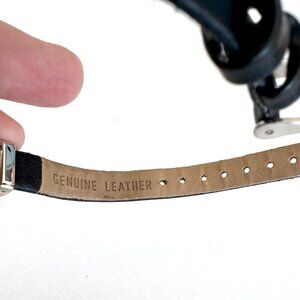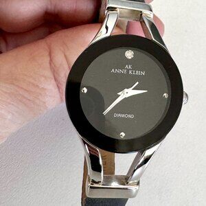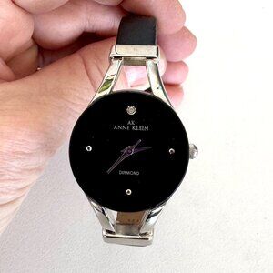 Anne Klein watch is silver tone and black with genuine leather strap. It has 1 nice little diamond on the face.