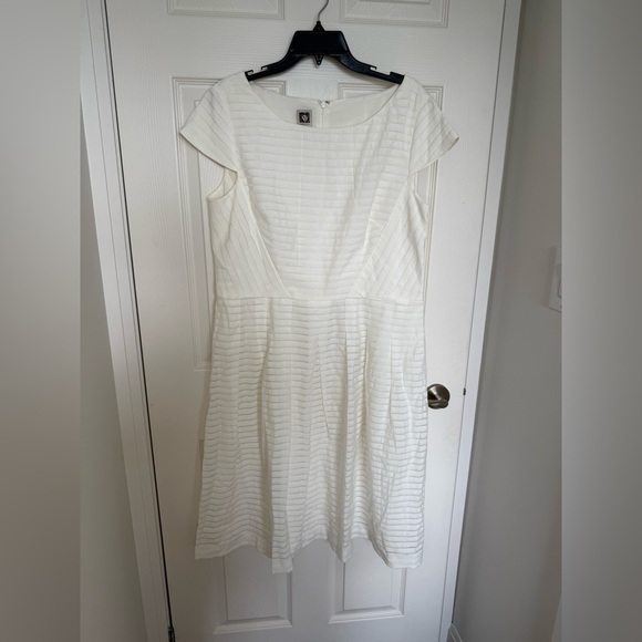 Elegant and timeless Anne Klein dress in a beautiful off-white shade. This flattering fit & flare silhouette features subtle horizontal textured stripes throughout, a scoop neckline, and cap sleeves. Fully lined with a concealed back zipper for a seamless look. Perfect for summer events, garden parties, or an elevated office outfit.