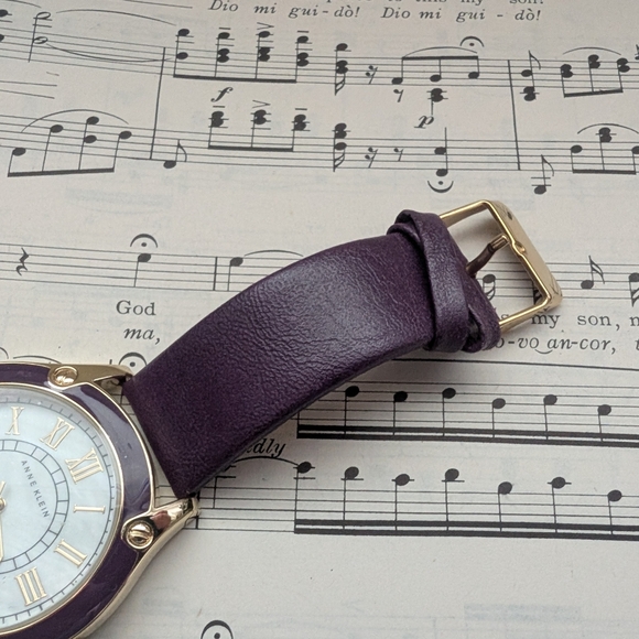 Elegant Anne Klein women's watch featuring a striking purple and gold design. Perfect for adding a touch of sophistication to any outfit.