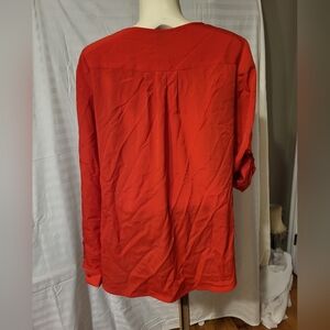This Anne Klein blouse in a vibrant red from a lightweight material, perfect for casual outings. Option to roll sleeves.