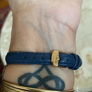 Navy blue leather strap with buckle closure