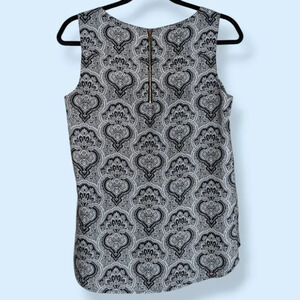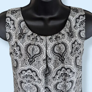 This contemporary sleeveless blouse by Anne Klein is made of 100% polyester and has a great intricate pattern in black and white. The blouse has a round neck with some pleating or rouching at the top, a gold tone metal zipper at the back of the neck, and a generous, flowy cut. The piece is less boxy when worn by a person, my mannequin just couldn't quite fill it out. Overall, this piece is in good condition.