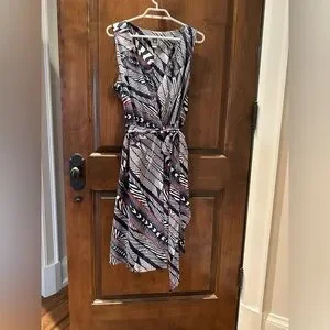 Abstract pattern v-neck sleeveless wrap dress. Figure flattering style. Fabric: 100% polyester.