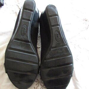 Anne Klein sport opened tones shoes. Patent leather with metal clasp Very good condition. Velour outer. Wedge heel,