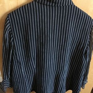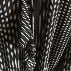 Anne Klein black and white striped silk shirt with polyester lining. Ruffle detail on front placket and cuffs.