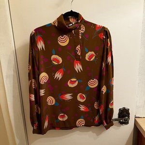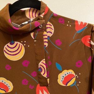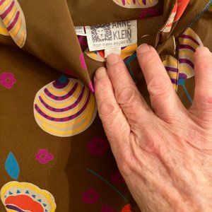 Vintage Anne Klein size 6 skirt with top, brown with multi coloured pattern, off center button on top with rounded collar, pockets on skirt, polyester so lite and flowy,