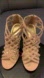 This peep toe heel features a geometric cutout design, stitching accents, and wrapped stiletto heel. Finished with lightly padded insole and back-zip closure.