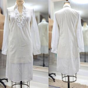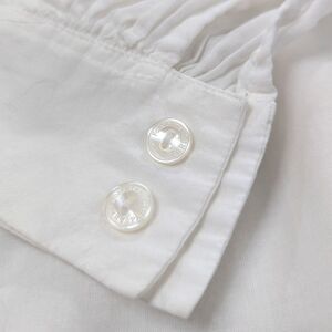 Light weight white cotton. Plunging collared V neck declote` with tie closure. Center front V yoke is smocked and is stretchy. Full length belled cuff sleeve has button closure.