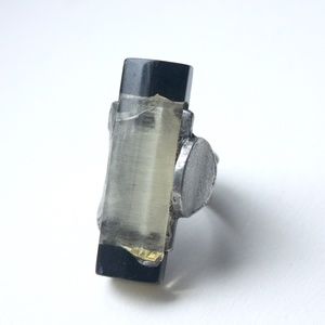 Designer Anne-Marie Chagon bague en résine et étain. La bague extra large au design contemporain est composée d'un élément rectangulaire en résine de couleur jaune pâle translucide et noire opaque monté sur un support d'étain.