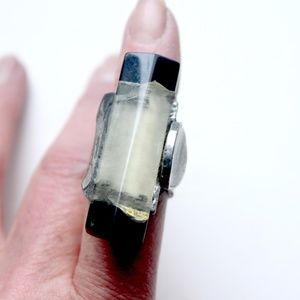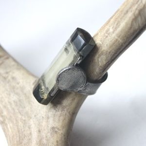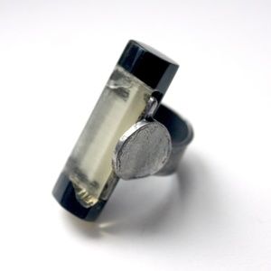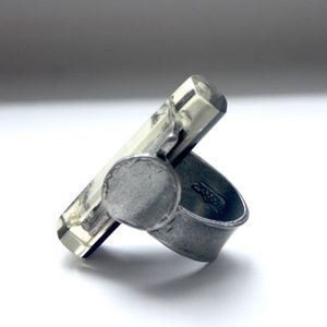 Anne-Marie Chagnon designer extra wide statement ring made of pewter and resin. Abstract modern ring made of pewter adorned with an extra wide rectangular resin acrylic element in opaque black and translucid smoke colors.