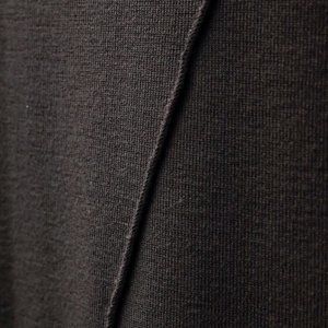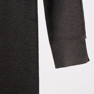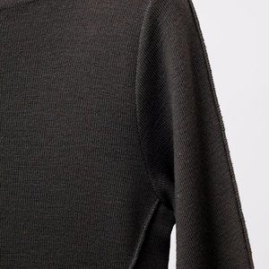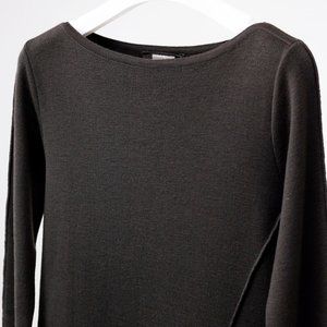 A wool knit sweater in dark grey from Annette Gortz featuring long sleeves, a round neck, an asymmetrical hem, and exposed seams.