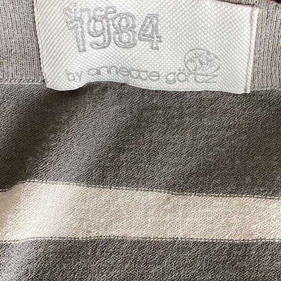 Grey cream asymmetrical striped boxy sweater has boatneck, long sleeves and asymmetrical hemline.