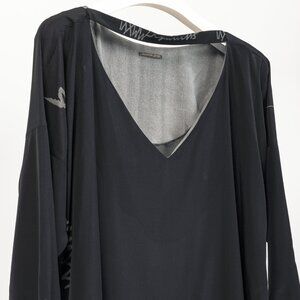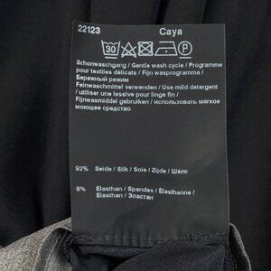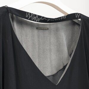 Made in Germany, this Caya dress from Annette Gortz's 2016 Spring and Summer runway collection is crafted in a black silk crepe de chine, and is printed with abstract grey scribbles at the top. It features 3/4 sleeves, drop shoulders, a V-shaped neckline with a back cutout, a grey gradient print throughout the bodice, and a mini-length hem.