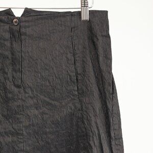 Circa 2009, the Split skirt and pant hybrid from Annette Gortz is crafted in a stretch linen with black and brown pinstripes, and features a front button and zip fly, front seam pockets, a back notch on the waistband, front leg openings, and a maxi-length bubble hem.