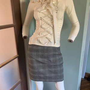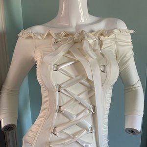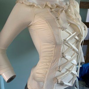 luxurious stretch fabric with lovely cream satin ribbon corset like detail looping through silver details. Three quarter sleeves.