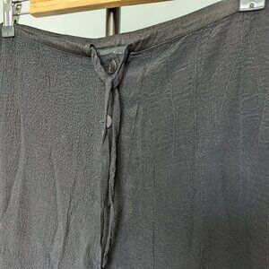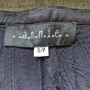 These beautiful wide leg drawstring pants from Canadian designer Annie Thompson are in excellent used condition. High rise, with wide and flowing textured fabric legs, front buttons, a drawstring waist and contrast panels on the bottom hems. No noted rips, holes, stains or areas of excess wear.