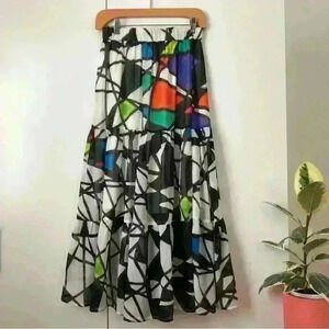 Airy and colourful, maxi length with three tiers and elastic waistband. Bold abstract geometric pattern in black and white enlivened with splash of bright accent colours in red orange, green, blue and purple segments. Skirts has a white lining.